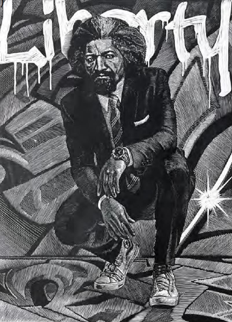 This print depicts a modern, determined, and fearless Frederick Douglass with the word “Liberty” spray-painted across a graffiti-inspired background.