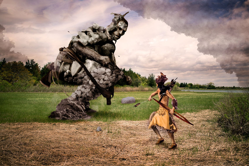 Chokanipok (Man of Flint) is a mythological figure from the Algonquian people. He fought many battles with his brother Manabozho. Manabozho’s arrows tore off pieces of Chokanipok’s body, which fell to Earth as pieces of flint. When Manabozho finally conquered Chokanipok, pieces of the giant’s body were scattered everywhere. This story explains why flint is so common in some parts of the country. The landscape is the Shinnecock Indian Nation.