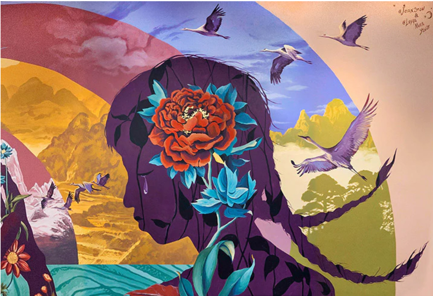 "For many migrants, seeds from their homelands are brought to the U. S. by their mothers and grandmothers. Each seed is a time capsule that can be planted in their new home. In these two collaborative murals, migrant artists: Jess X. Snow and Layqa Nuna Yawar collectively trace their ancestral roots of the Incan ruins and Andean active volcanoes of Ecuador, and the fog covered mountains and rice terraces of southeastern China. The silhouettes used are the artist's interpretation of their own childhood selves. The hands depicted are that of the artists' own mother. Along with symbolic flowers indigenous to each of our homelands, woven into the mural are ingredients used in diasporic cuisine that were carried by our mothers when they brought us to America. Seeds that bloom into bell flowers and peonies indigenous to Ecuador and China have also travelled with our people across borders along with the cranes, condors, and hummingbirds. When we map the oceans and mountains that our families crossed to get to America and create self portraits from collages of our own homelands, we give name and voice to the lands we lost. We reclaim our heritage, and heal ourselves, each other, and our own families from the inter-generational traumas caused by migration."
