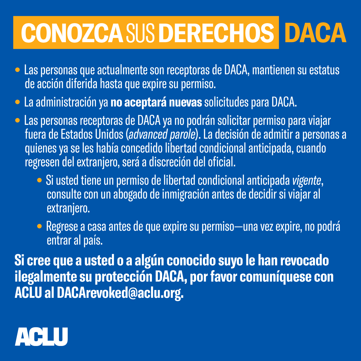 The ACLU has filed a class action lawsuit on behalf of people whose DACA was wrongly revoked. If you or someone you know have had your DACA wrongly or arbitrarily revoked, please contact the ACLU at DACArevoked@aclu.org.