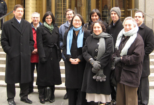 Plaintiffs, experts, and the ACLU and PUBPAT legal team outside the courthouse. Back row, from left to right: Dan Ravicher, PUBPAT; Robert Nussbaum, University of California, San Francisco; Tania Simoncelli, ACLU; Chris Hansen, ACLU; Sabrina Hassan, PUBPAT; Aden Fine, ACLU; Chris Mason, Cornell. Front row, from left to right: Sandra Park, ACLU; Lenora Lapidus, ACLU; Elsa Reich, NYU
